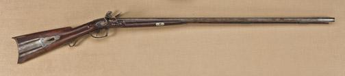 American side by side flintlock double rifle with iron patchbox and “Kentucky Styling”. .38 caliber, both full rifled barrels. Shows half-stock, iron triggerguard and mounts, with iron patchbox, no signature but appears western-Pennsylvania to Kentucky in styling. The rifle measures 51” overall, with 36” barrels. The stock is somewhat plain in styling with straight grain. The metal surfaces show some pitting and erosion and the rifle has been reconverted expertly back to flint. There is some loss of wood around the left rear of the lockplate, otherwise the stock is good, metal is fair to good, with some pitting particularly on the breech of the barrel. From the Bernard Braverman collection. Est: $1,500 - 3000