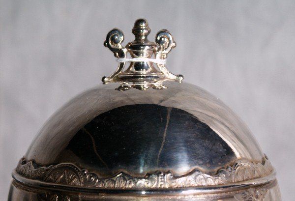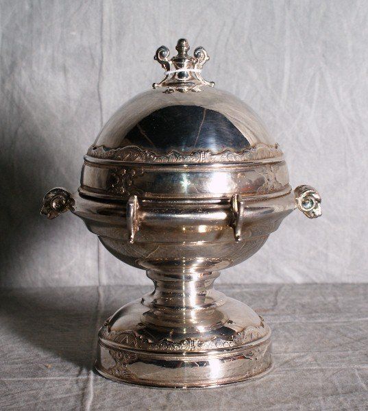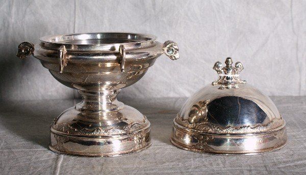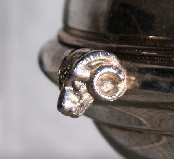 American silver plate dome covered butter dish with rams head handles. H:9.5" .