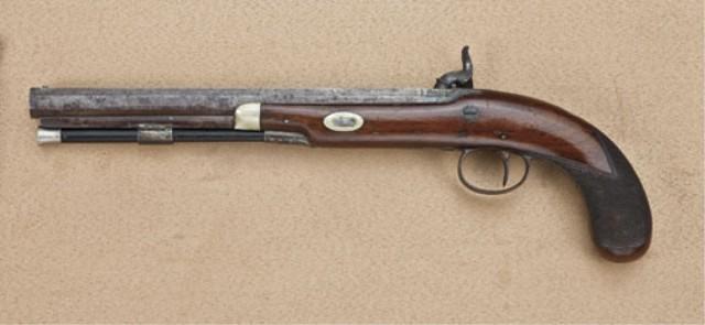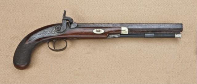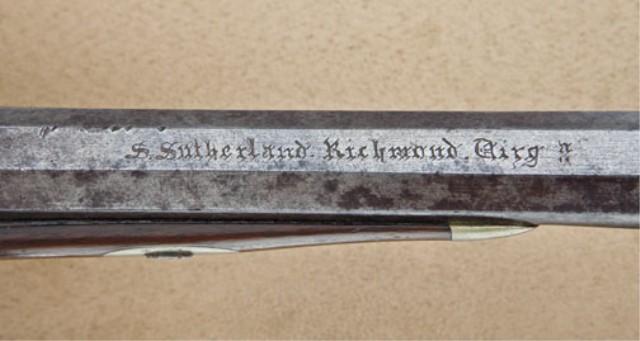 American single-shot percussion dueling/target pistol, signed “S. Sutherland, Richmond, VA” in fancy script on barrel. Showing back action, late percussion lock, iron mounts, checkered half stock, German silver trim, approx. .52 caliber smoothbore with 10-1/8” barrel. 15-1/2” overall. Good quality with nicely engraved mounts, banded at breech. The barrel shows strong traces of original brown going to patina with some lightening at the edges, staining, and just beginning erosion and pinprick pitting. The lock, hammer, and breech show considerable case hardening within their natural patina, but some colors are visible. The varnish wood stock has good sharp checkering and is in very good condition with just a few minor bumps and mars in the varnish. The ramrod ferrule has been soldered long ago. The action is crisp, the ramrod is original to the period. A very well preserved and good condition pistol by a well-known Southern maker. From the William R. Orbelo Collection. Est: $1,500 - $3,000