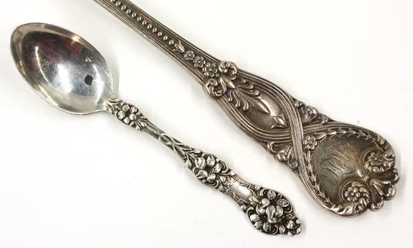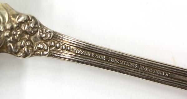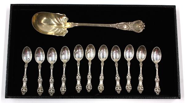 American sterling silver flatware consisting of a Tiffany & Company serving spoon in the ''St. James'' pattern, designed by Paulding Farnham, 1898; together with eleven Alvin demitasse spoons in the ''Old Orange Blossom'' 1905-1995, 6.99 troy oz.
