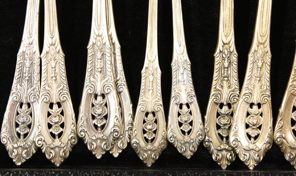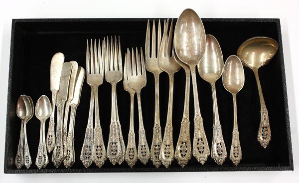 American sterling silver partial flatware service by Wallace, in the ''Rose Point'' pattern consisting of six spreaders, five demitasse spoons, four luncheon forks, two tablespoons, place spoons, salad forks, and serving forks, one teaspoon and ladle, 25 pieces total, 26.30 troy oz.