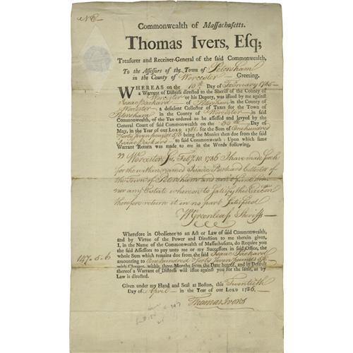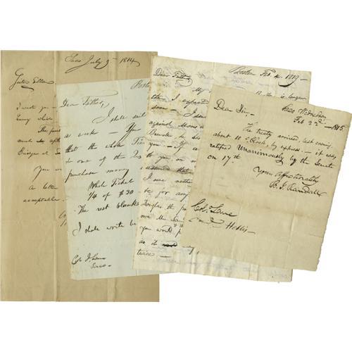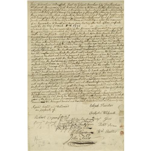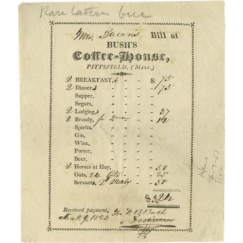 <B>Americana Document Collection</B></I> consisting of more than 50 documents, receipts, and letters with a wide range of dates (1600s to 1900s) and subjects (taxes, tobacco, oil, coffee, etc). A few of these interesting items are listed below: <BR><BR>Benjamin J. Russell. A wonderful series of twelve handwritten family letters dated from 1814 to 1827. The content is great -- he talks not only about personal affairs but also about national happenings. Fascinating reading. <BR><BR>1825 Tavern Bill for Mrs. Bacon at Bush's Coffee-House, Pittsfield, Massachusetts totaling $3.24. <BR><BR>1771 Dated Servant Indenture. A manuscript document with multiple signatures, in part: ".. of the Town of Stoughton in the County of Suffolk in New England...place and bind out Rachel Rogers a poor child belonging to the Town and County aforesaid... after the Manner of an Apprentice to Dwell and Serve from the Day...until the 25 Day of March A.D. 1776..." <BR><BR>There is a particularly large group of documents in this lot that would display very well. Also, there is much material of interest to the genealogist. Consider these to be "snapshots" of life in a different day and time. Generally very good to fine condition. From the Henry E. Luhrs Collection. Accompanied by LOA from PSA/DNA. <BR><BR><B>Important notice:<