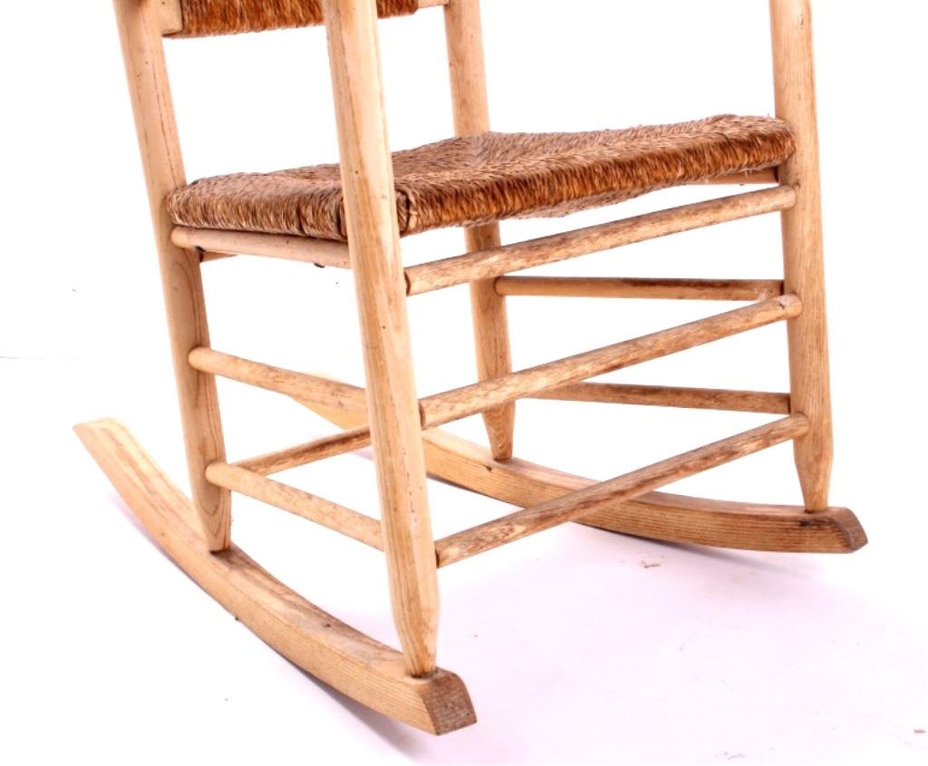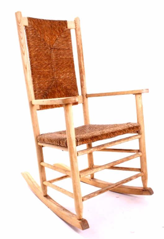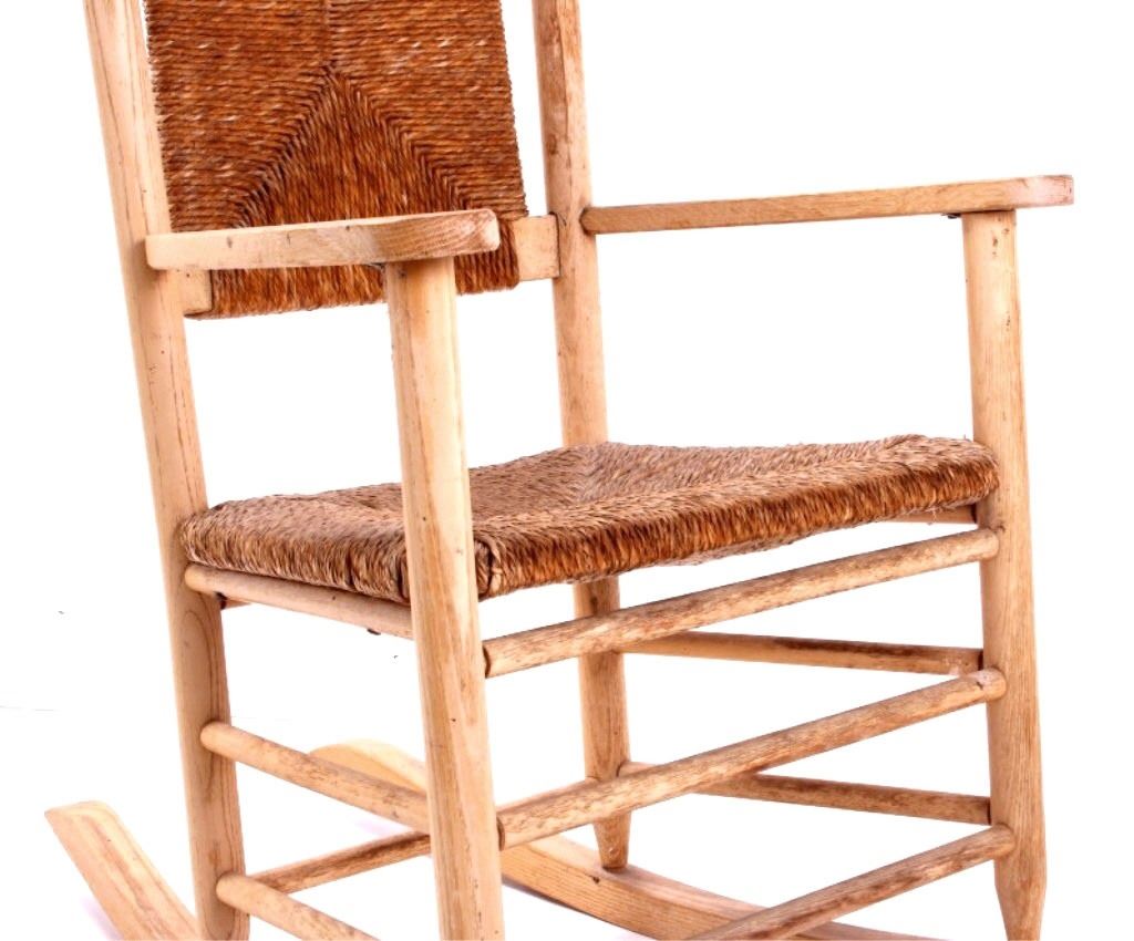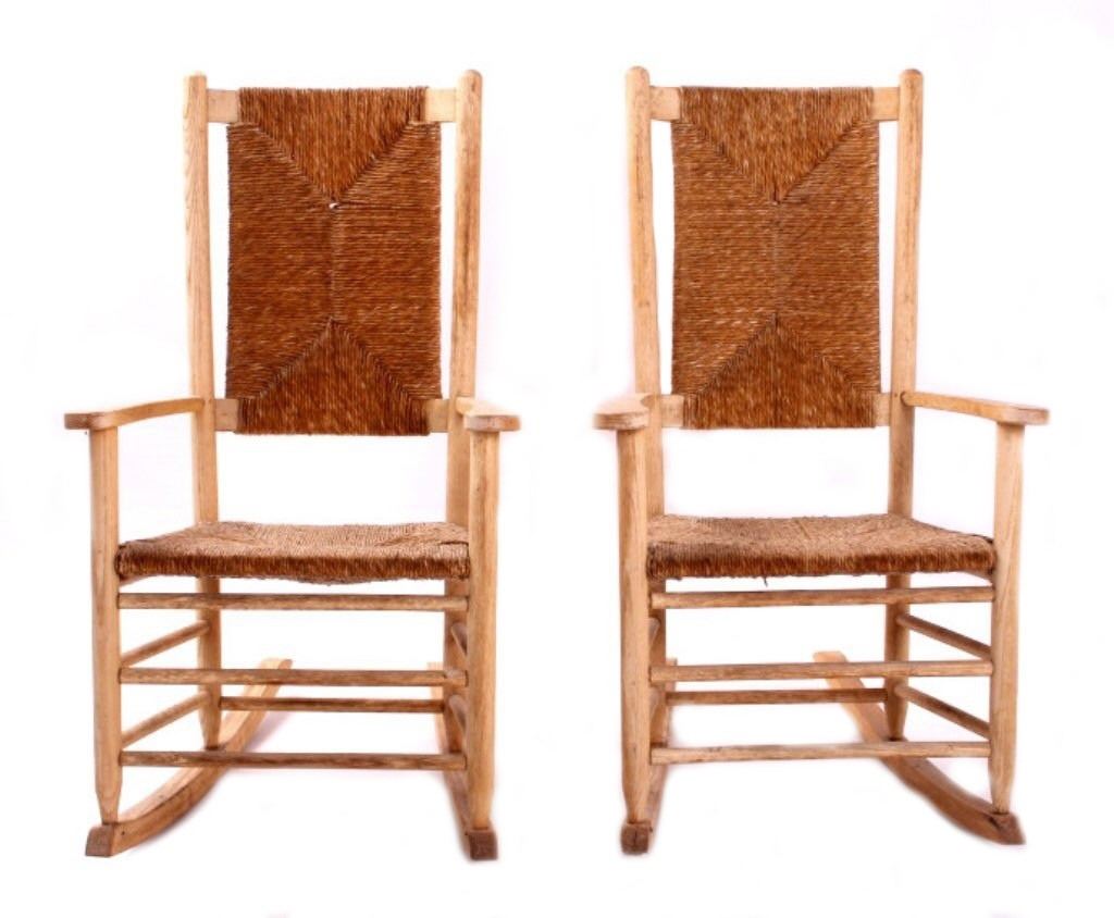 The lot features a truly nostalgic Americana set of two wooden rocking chairs with wicker seats and backs. Found on the front porch of countless American homes and in novels, movies, shows, and stories of the past are similar antique-to-early wooden wicker rocking chairs—a glimpse into the American pastime. Each example shows a solid wood construction with a thick, beautifully woven wicker back and seat in overall good condition for their age. This matched set has a nice blonde to light brown coloring and will bring a touch of Americana to your new porch. Each chair measures 24" wide, 29.25" deep and 41" tall.
