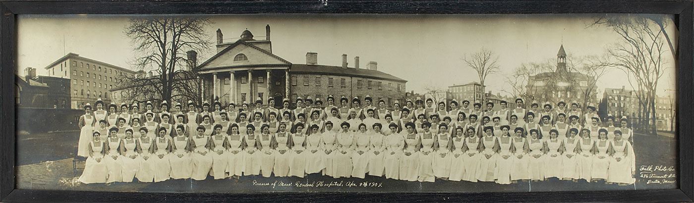 Vintage original matte-finish 35.5 x 9.5 panoramic portrait of the 1909 roster of nurses at the Massachusetts General Hospital on Fruit Street in Boston, taken by the Falk Photo Company on April 8, 1909, and showing the nurses posing in front of the impressive Bulfinch Building. Framed to a slightly larger size. In very good to fine condition, with some light silvering, a short tear, and faint vertical folds, none of which detract from the attractive image.
