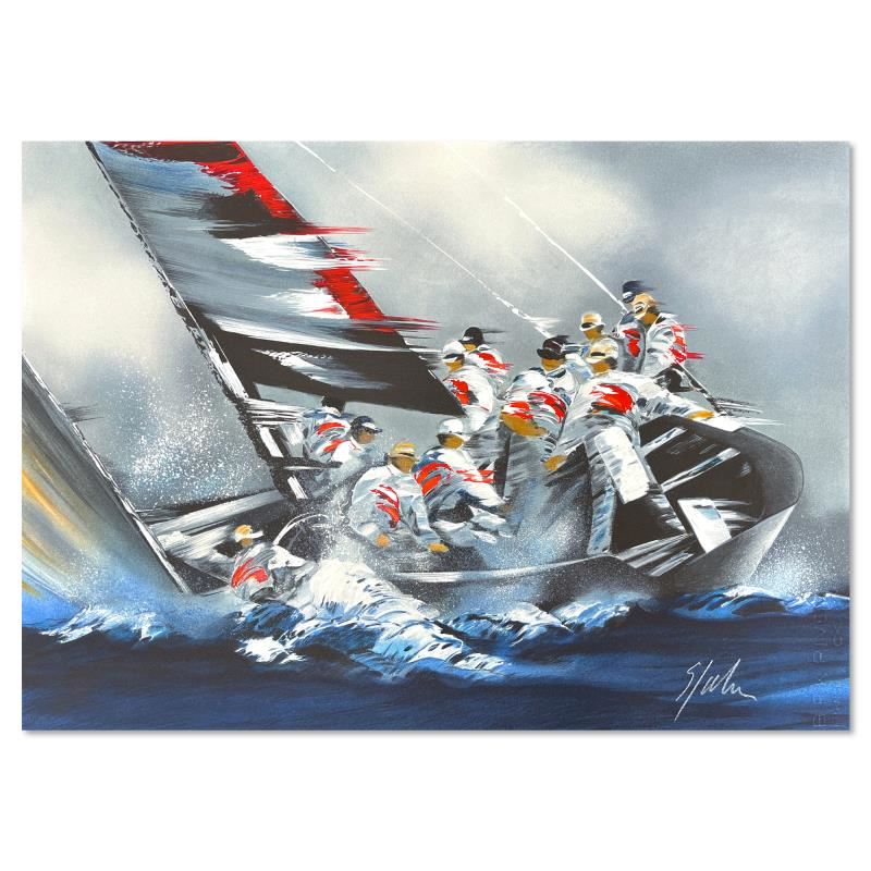 "Americas Cup - Alinghi" is a limited edition lithograph on paper by Victor Spahn. Printed at Art-Lithographies workshop in Paris the piece is hand signed by the artist and comes with a certificate of authenticity. Measures approximately 17" x 23.5" (image).