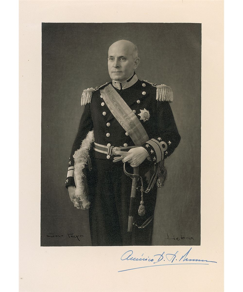 Politician and admiral (1894–1987) who served as the 13th president of Portugal. Vintage matte-finish 6.25 x 9 three-quarter length photo of Tomas in full uniform and holding his plumed hat by San Payo of Lisbon, signed in the lower border in blue ink, “Americo D. R. Tomas.” Photo is affixed by its top corners into its original presentation folder. In fine condition, with some light bends along top edge from adhesive.