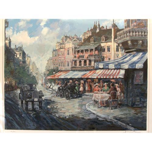 Here for auction is print by Americo Makk. The piece is appraised at $2,000. This is a Serigraph piece and the title can be found on the Certificate of Authenticity. The piece is signed "Americo Makk" in pencil on the lower right and the edition, 191/350, is in pencil on the lower left. The print depicts a French street scene with a road moving diagonally from the lower right to the mid right. The right side of the road is filled with colored awnings, street cafes and crowds of people. The Certificate of Authenticity provided by the owner states that the work was purchased by the owner at the Le KAE Galleries of Fine Art, Palm Desert, CA.