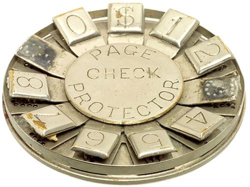 Amerikanischer Scheck-Perforator "Page" 1912 € 75,- Taschenformat, Ø 7 cm, mit 2 Braille-Tasten, vernickeltes Blech. – Sehr selten! Check Protector "Page" Pocket size, Ø 2 3/4 in., with 2 Braille keys, nickel-plated. – Very rare! – (2/2) – € 100/180 – (200/28)