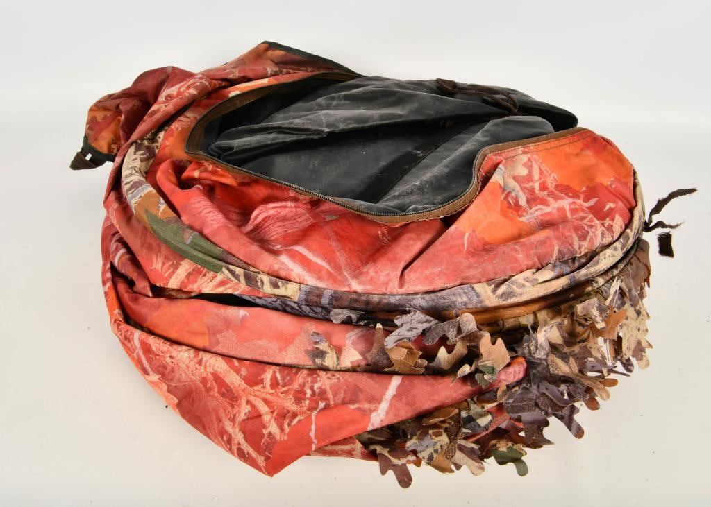 lot contains one Ameristep Multi Season Dog House Pack In Blind comes to as pre owned; Getting sent to the doghouse is no longer punishment; its the greatest reward. The Doghouse spring steel blind travels easily and sets up quickly to conceal two hunters inside. The exterior features a large, open window perfect for firearm hunting, with the option to add provided shoot-through mesh covers to each porthole. The matte finish of the Durashell Plus fabric and 3D Edge ReLeaf trim blend well with the natural environment, and an interior ShadowGuard coating helps eliminate shadows and silhouettes. Also with this lot we have a reversible canvas jacket, bright orange on the inside and camo on the outside, sleeves measure approx 24" from shoulder to hem, we also have a Vecta XL camo print thick pullover sweatshirt