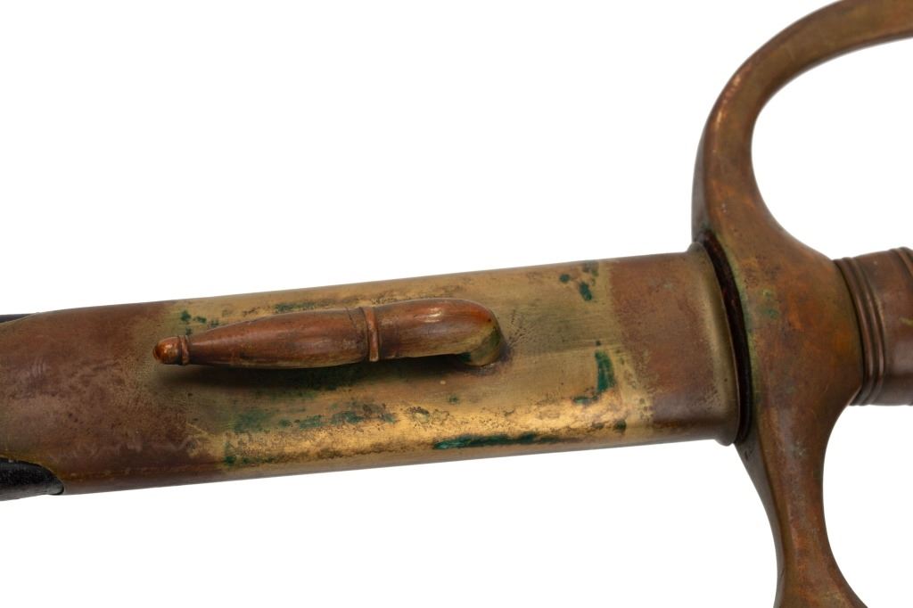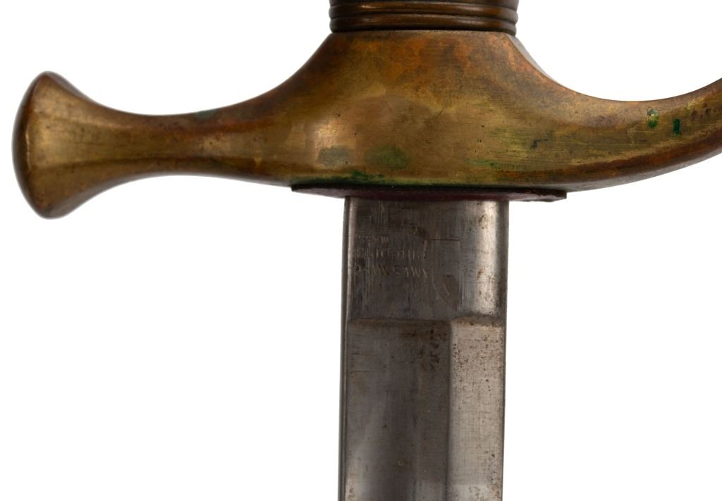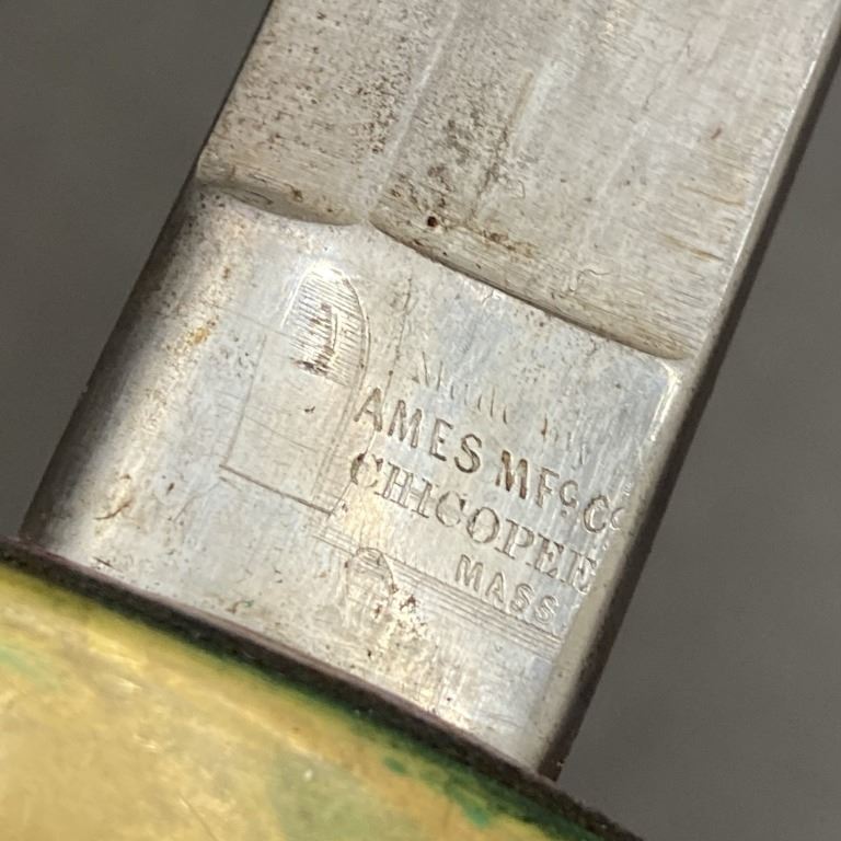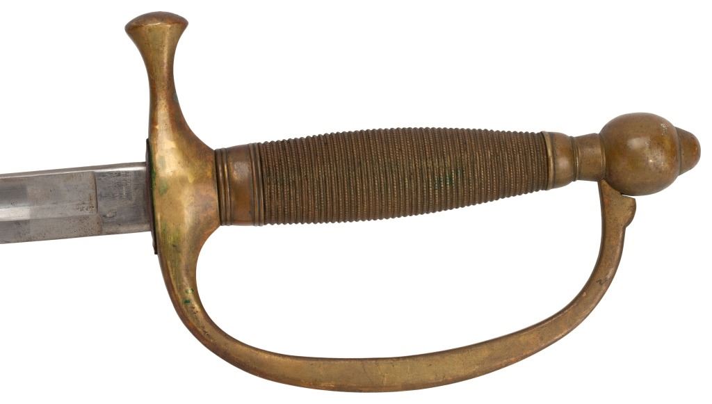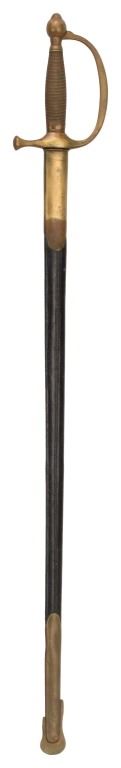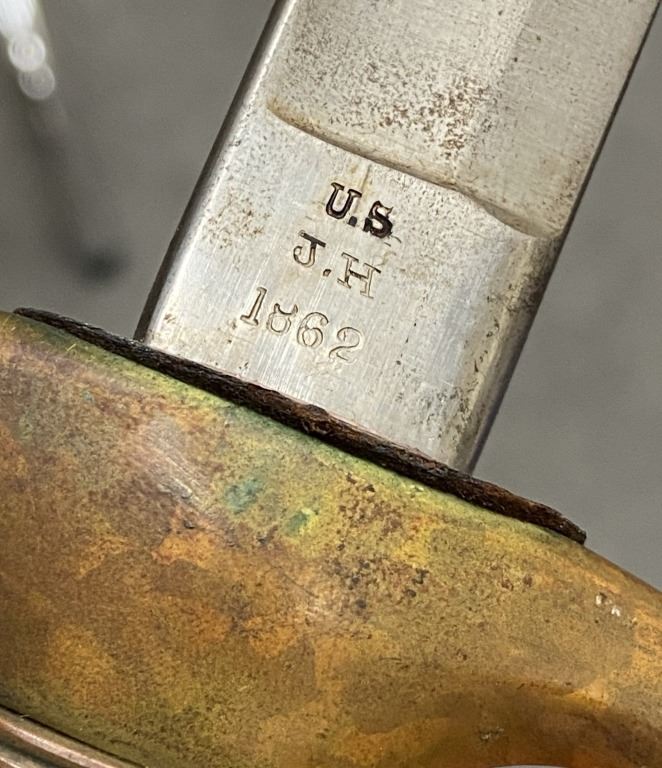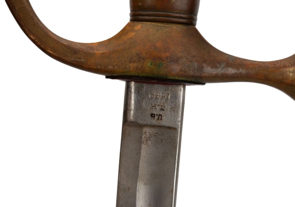 Item/Description: American Civil War US NCO Officer / M1840 Musicians Sword by AMES. Ricasso marked "Made by Ames Chicopee, Mass" to one side and "U.S. J.H. 1862" to the other. Brass handle with brass and leather scabbard.