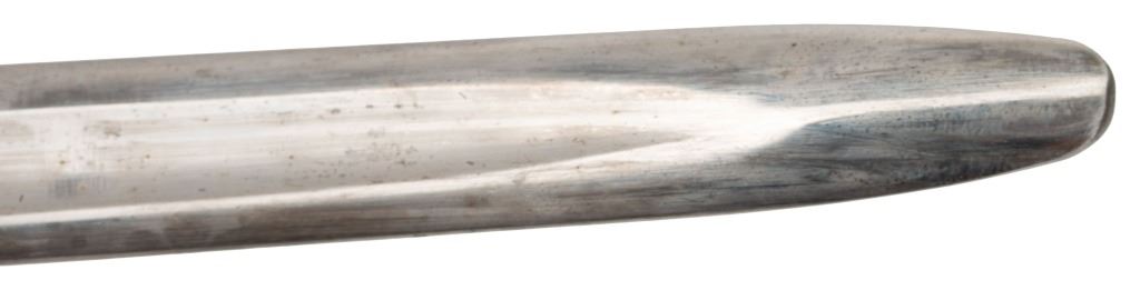 Condition: Signs of age and wear include surface scratches, scuffing, oxidation, and pitting. Scabbard has bend/break to the leather.