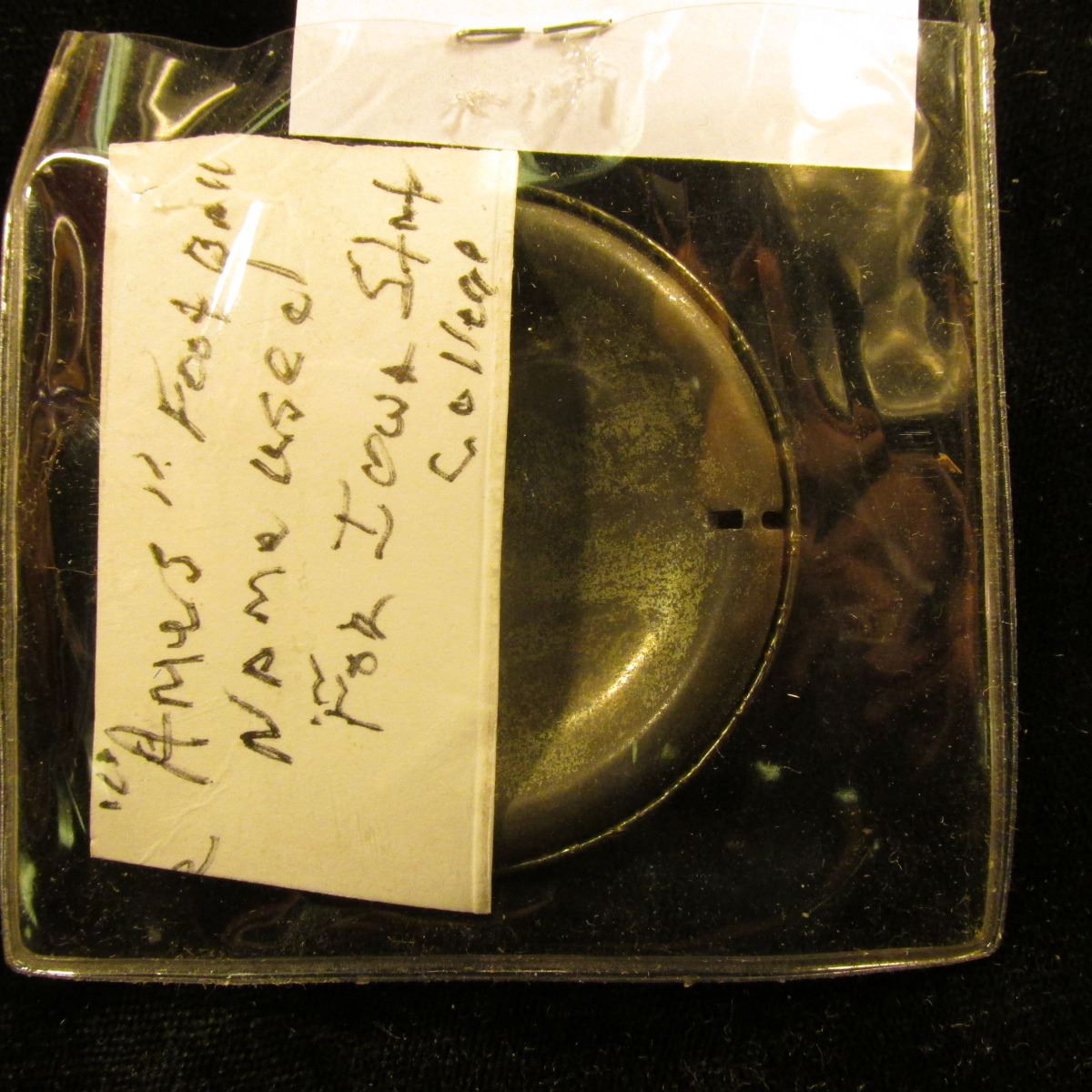 "Ames 1913" Pin-face, no pin for back, 'Doc' notes "Ames" Football name used for "Iowa State College