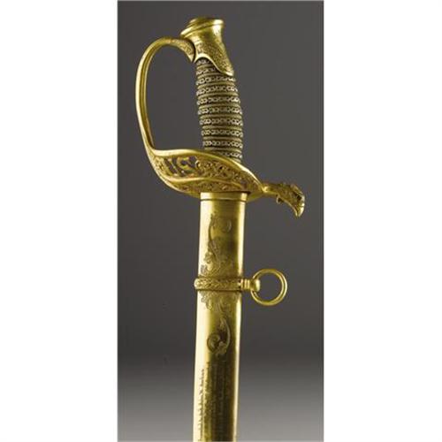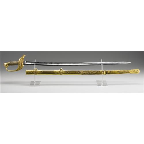 <B>Union Officer's Presentation Civil War Sword to Colonel John H. Jackson, 3rd New Hampshire Volunteers - Fort Wagner Charge Leader.</B></I> <BR><BR>A beautiful presentation sword presented to Colonel John H. Jackson of the 3rd Regiment of New Hampshire volunteers by the drafted men under his command. The ornate gilt scabbard is engraved with the inscription "Presented to Col. John H. Jackson, 3rd Regt N.H. Col's, by the 3rd Detachment of N.H. Men Under His Command at Long Island, Boston Harbor, as a token of their esteem, Oct. 20th, 1863."<BR><BR>This Collins and Company blade is finely etched and is marked "Hartford, Connecticut, 1862." The grip is gold braided and the guard has a gilt "US" in a foliate pattern. The hand-engraved scabbard is stunningly gilded and is made by the Ames Manufacturing Company of Chicopee, Massachusetts. Ames made scabbards for many such presentations swords, particularly for Collins and Company. The sword is in overall very good condition with about 60% of its original, uncleaned gilt. There are several dents in the forward end of the scabbard and some pitting wear on the blade.<BR><BR>John H. Jackson of Portsmouth, New Hampshire rose to the rank of Colonel of the 3rd New Hampshire Volunteers. During the Civil War, his unit fought at the Battles of Bluffton, Pocotaligo, James Island, and Morris Island. On July 18, 1863, at the assault on Fort Wagner made famous in the movie <I>Glory,</B></I> Colonel Jackson was wounded in the chest. Almost every Union officer was killed as they led repeated yet fruitless charges. Although seriously wounded, he was not out of the war yet. On the way back to New York, the hospital ship carrying Colonel Jackson, the <I>Arago,</B></I> encountered a rebel blockade-runner. The captain of the <I>Arago</B></I> gave chase and rammed the rebel ship. Colonel Jackson rose from his sick bed and led a boarding party to help capture the adversarial blockade-runners.<BR><BR>This presentation sword is equally beautiful and historic, having seen action at one of the most storied battles of the war. The sword comes with a volume of published material concerning the sword as well as information on provenance. <BR><BR>Published: <I>Gun Report Magazine</B></I>.<BR><BR><I>Provenance</B></I>: Jackson Family, prominent collector<BR><BR><b>Shipping:</b> Large Collectibles (<a target="_blank" href="http://www.heritageauctions.com/common/shipping.php">view shipping information</a>)