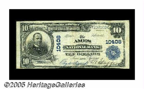 <B>Ames, IA</B></I> - $10 1902 Plain Back Fr. 630 <B>The Ames NB</B></I> Ch. # 10408<BR>An attractive large example from Ames' other issuer. Nice <B>Fine+++,</B></I> with two color pen signatures of Clay W. Stafford and F.W. Stafford.
