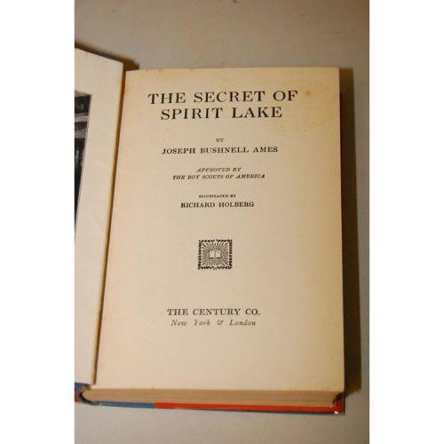 Ames, Joseph Bushnell. The Secret of Spirit Lake. New York: The Century Co., 1927. 12mo - over 6¾" - 7¾" tall. Hard Cover. NOT EX-LIBRARY. Good Condition, with a Dust Jacket in same. Illustrated by Richard Holbery, Approved by the Boy Scouts of America. vii [1] 219pp, with frontis and 3 plates, as called for. Bound in blue illustrated cloth. Front hinge cracked, foxing to frontis & title page, inscription on ffp. Dust jacket shows edge wear/tear/chips, protected in a mylar cover.