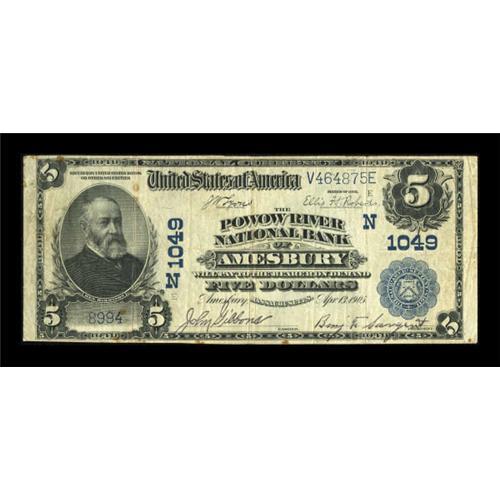 <B>Amesbury, MA</B></I> - $5 1902 Plain Back Fr. 598 <B>The Powow River NB</B></I> Ch. # (N)1049<BR> This note features the second nomenclature used by the bank, and features an always popular title. The paper is bright for the grade, though there is some minor spotting. <B>Fine.</B></I><BR><BR><b>Shipping:</b> Coins & Currency (<a target="_blank" href="http://www.heritageauctions.com/common/shipping.php">view shipping information</a>)