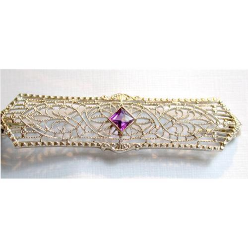<tr><td>Title:Amethyst 10K Filigree Bar Pin </td></tr>