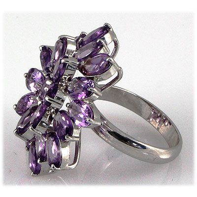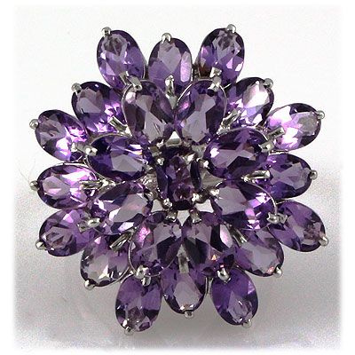 Amethyst 21.25 ctw Flower Design Ring 0.925 Silver **|**|** Mainstone: Amethyst ; CTW: 21.25 ; Shape: Oval Cut ; Gem Size: 7x5mm ; Metal / Purity: 0.925 Sterling Silver ; Grams: 8.12 ; MSRP: $400