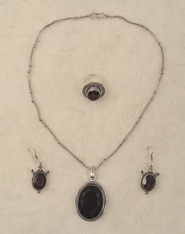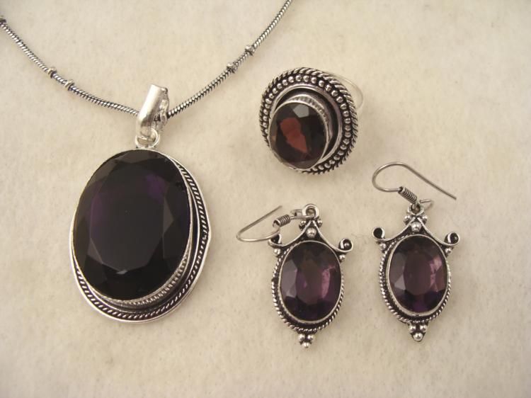 Sterling Ring, Pendant Necklace and Earrings Set * Gemstones: Amethyst Pendant: 15 x 32 mm stone, on sterling setting with twist border, on 17" chainRing: 1", on sterling setting with beaded and twist borderEarrings: 1", with curls, beads, and twist borderCondition: Excellent