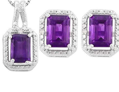 Classic emerald cut 3.0ctw genuine Amethyst gemstones set with .02ctw diamond accents in Sterling Silver. Sterling Silver 18" twist chain and friction backs for earrings included! 4.5g