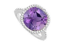 A larger prong-set square amethyst in the center & is surrounded by small gold beads along with four brilliant-cut diamonds sparkling in the middle of the square side between gold beads. Other smaller gold beads adorn both sides. This gorgeous ring is made in 10K white gold & has a total gem weight (TGW) of 2.05 carats.