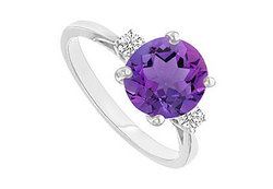 A round purple amethyst is prong-set in the center & is flanked by two smaller brilliant-cut diamonds on each side. Made in 14K white gold this ring has a total gem weight (TGW) of 0.75 carat.