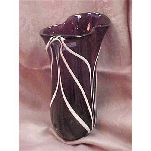 This 9.5" amethyst blown art nouveau style vase with a white glass overlay free form design speaks for itself. The hand-etched mark on the bottom of the vase is the number "88" encompassed by a crown with the letters "WRK" below the crown.