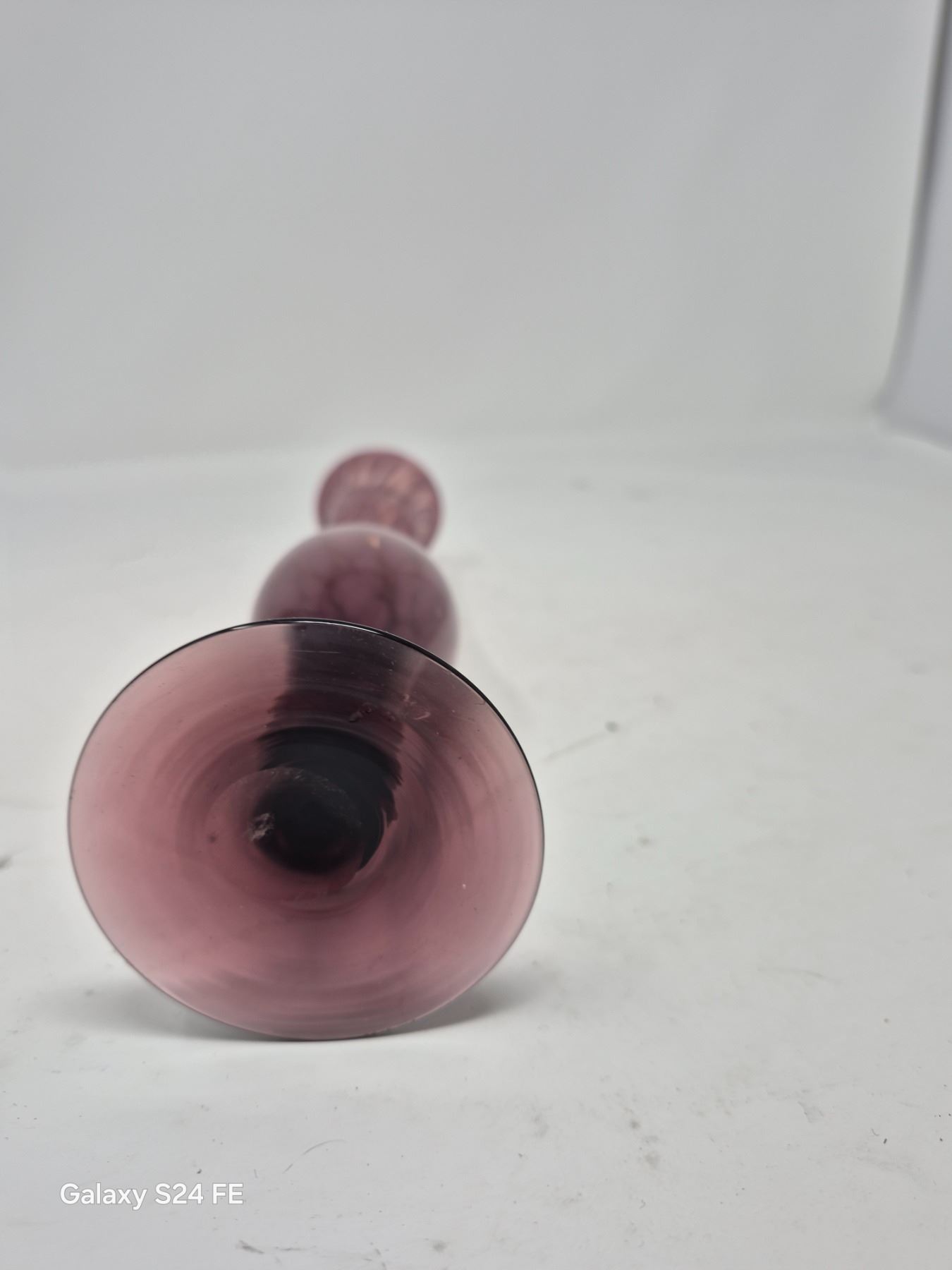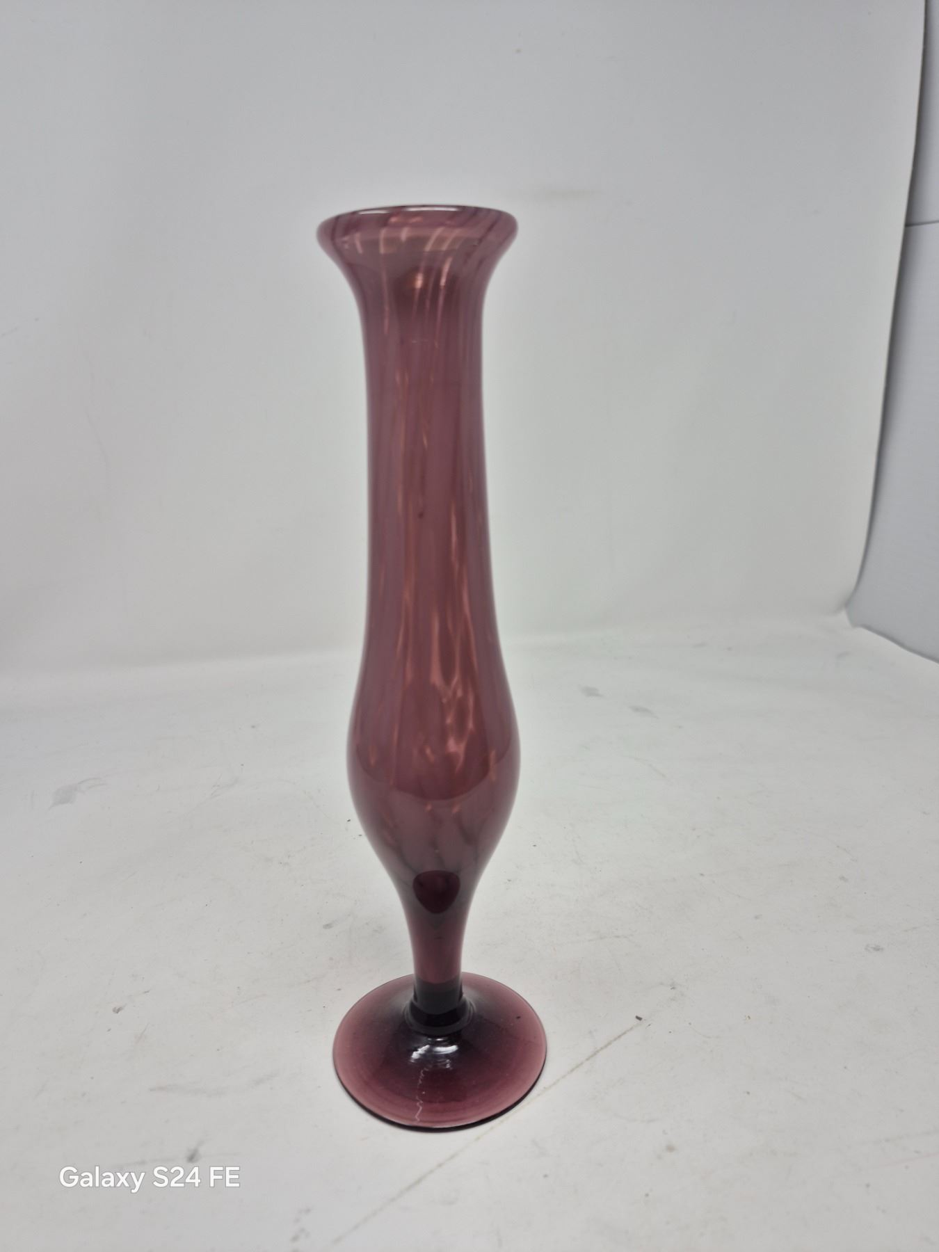 Elegant hand-blown amethyst glass bud vase with a flared lip and rounded base.