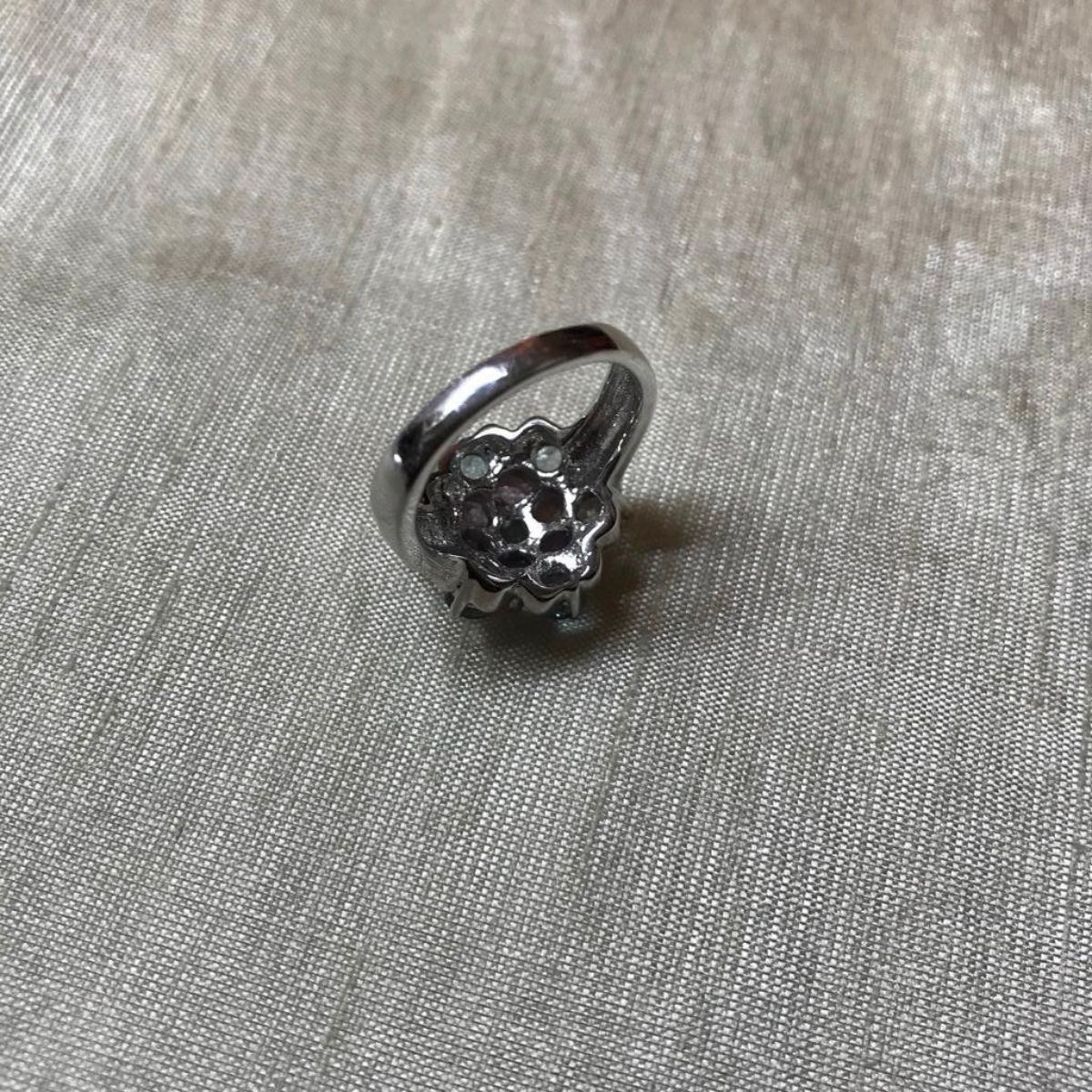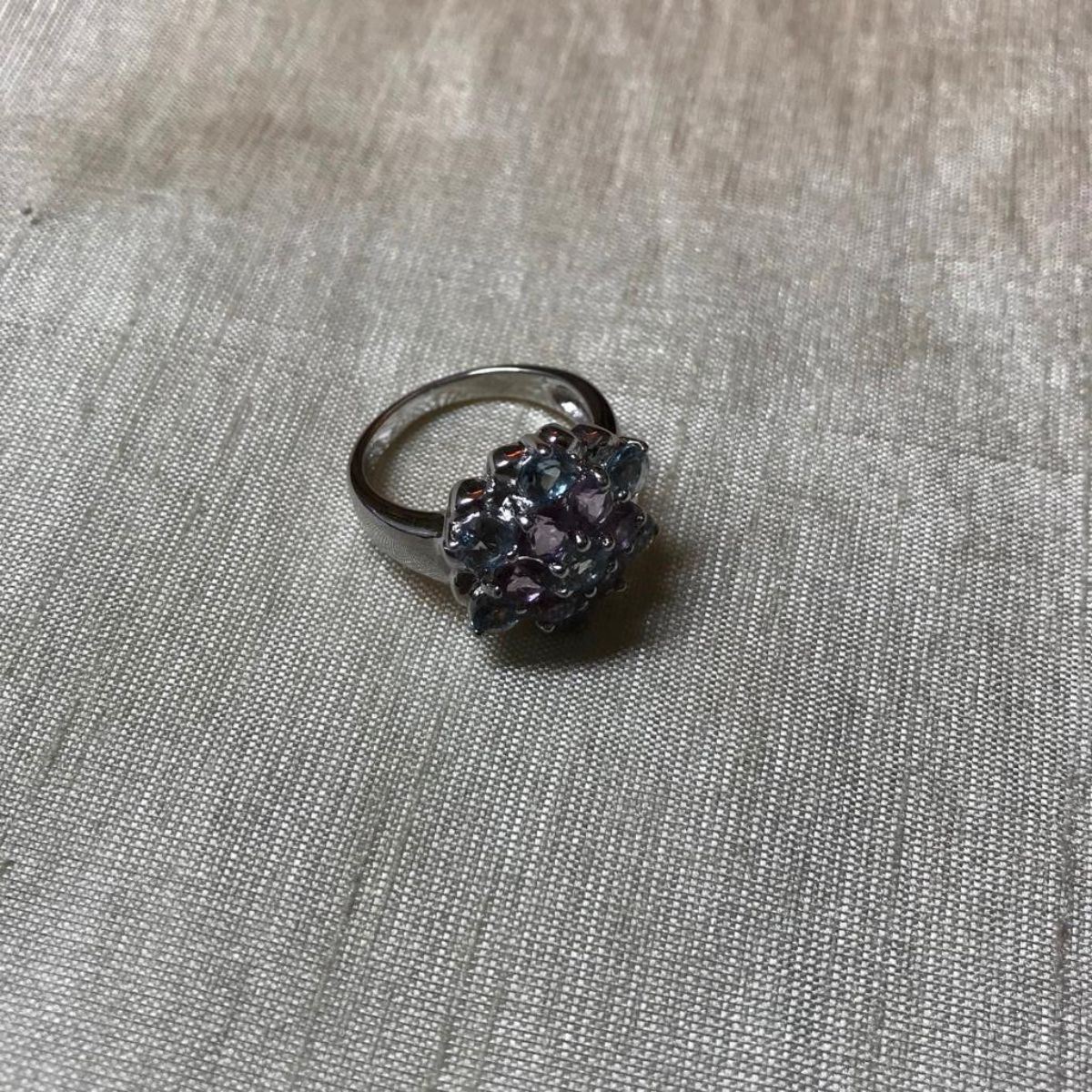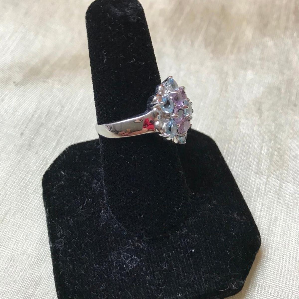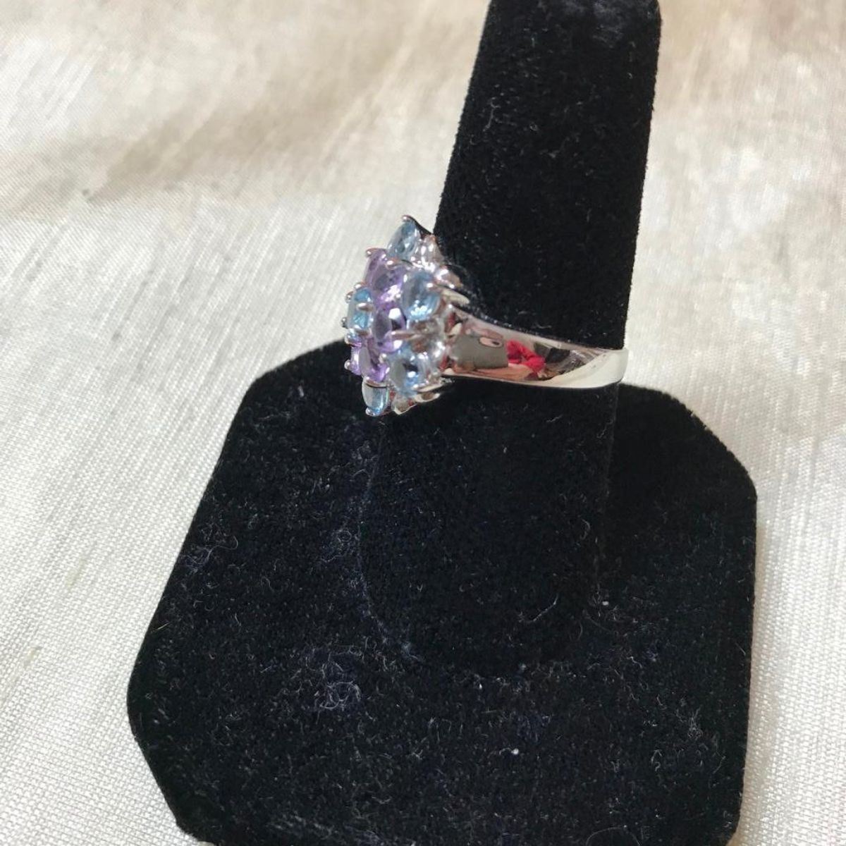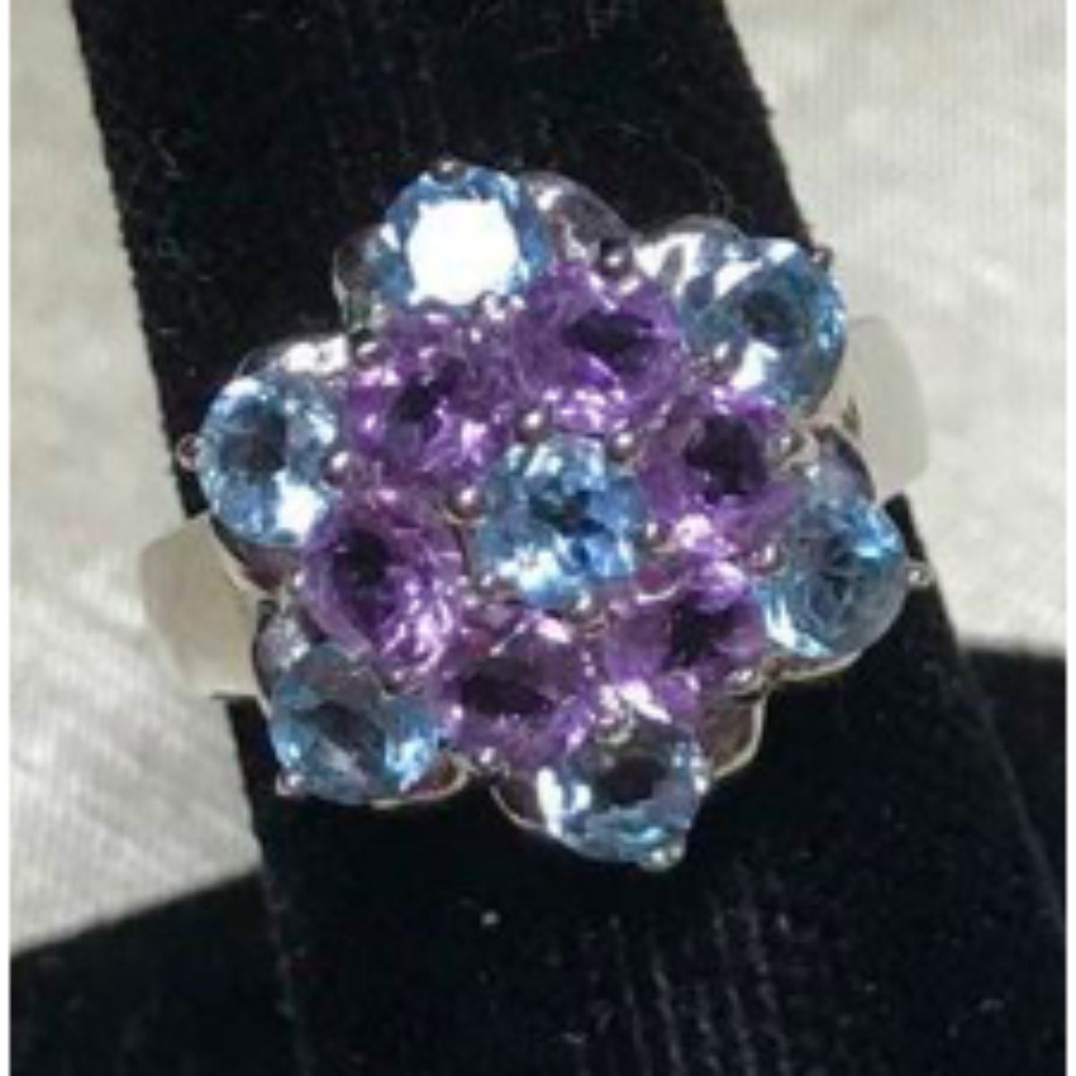 28Light blue topaz round facet gemstones ( seven total, 3mm ) & light purple amethyst round facet gemstones ( six total, 3mm ) set into a sterling silver flower form ring. Size 7.