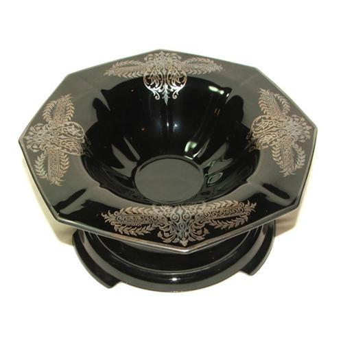 Very striking octagonal black glass footed bowl with sterling silver overlay and matching black glass pedestal.</em></td>