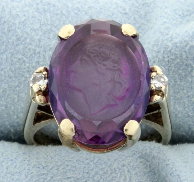 In 14K yellow gold, this ring contains 18mm Cameo in Amethyst gemstone, with great detail. Also two 3pt diamonds. Size 7 8.7g
