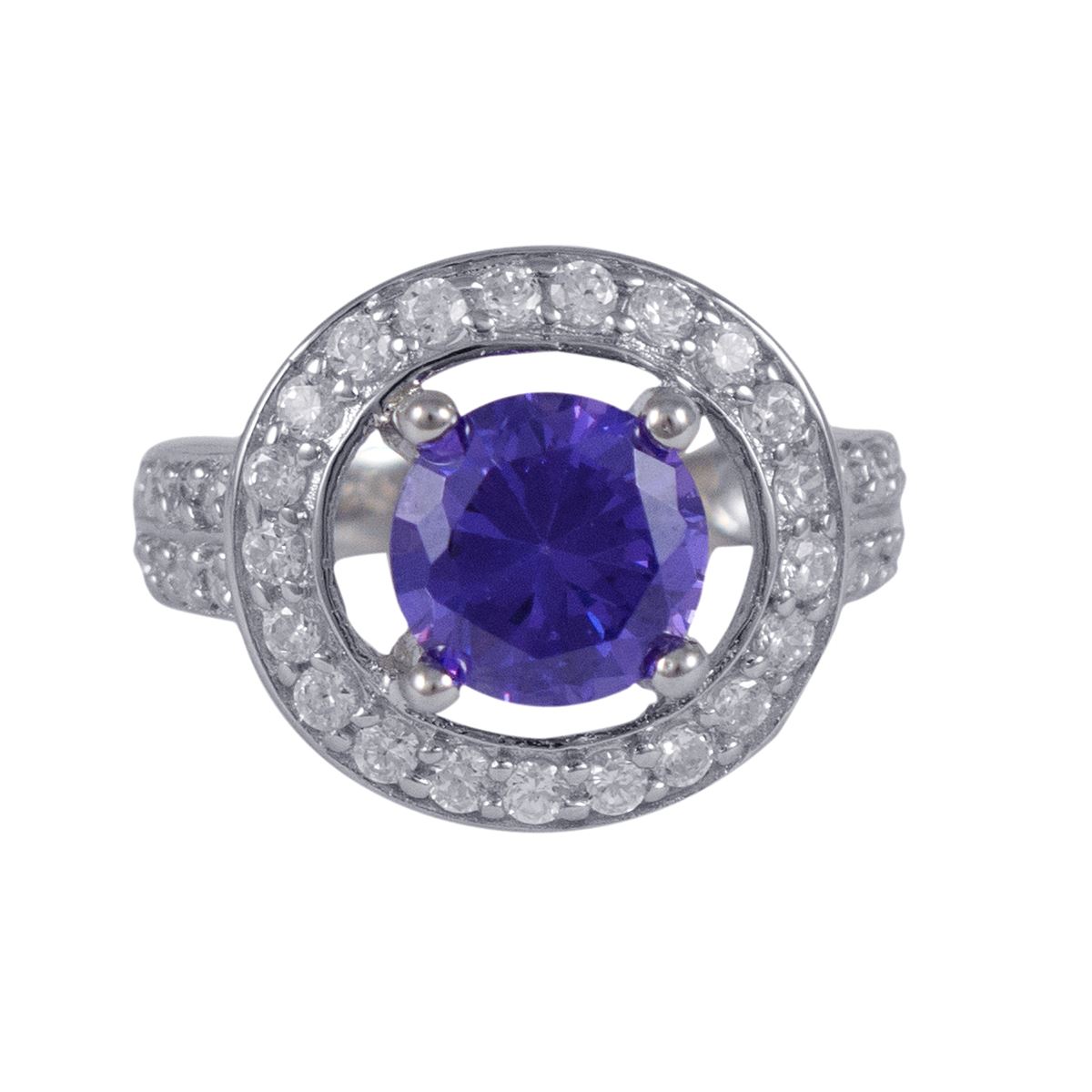 Amethyst Color Round CZ, Surrounded With White Czs, Sterling Silver Ring Size 5