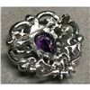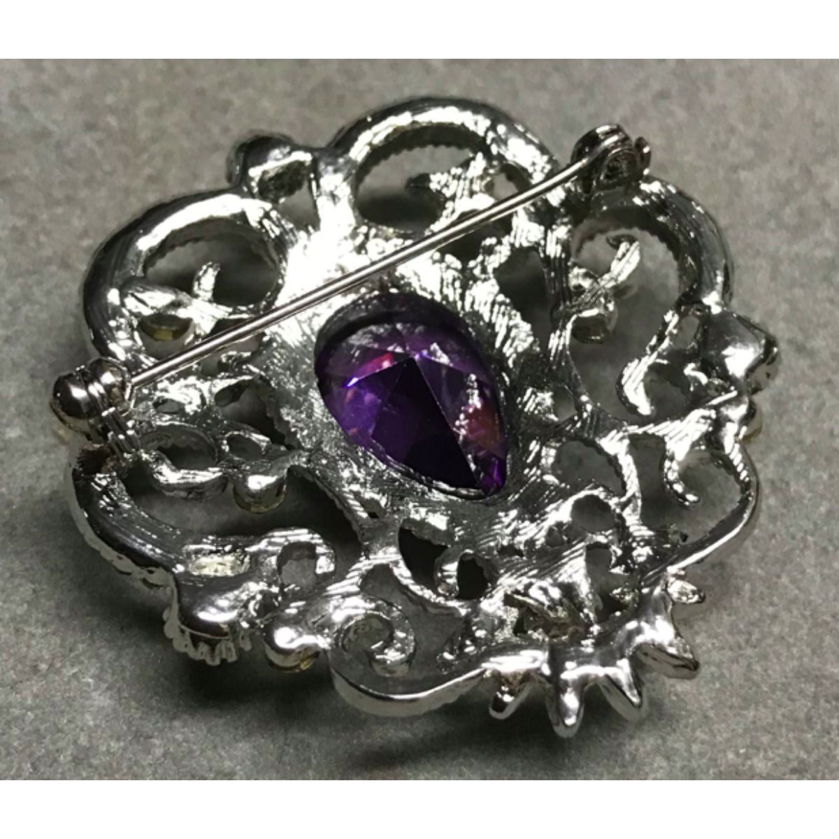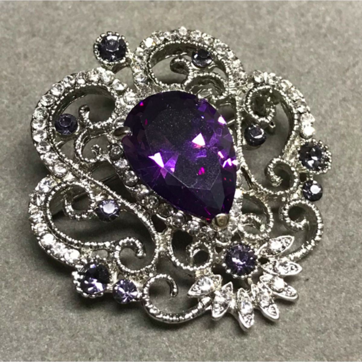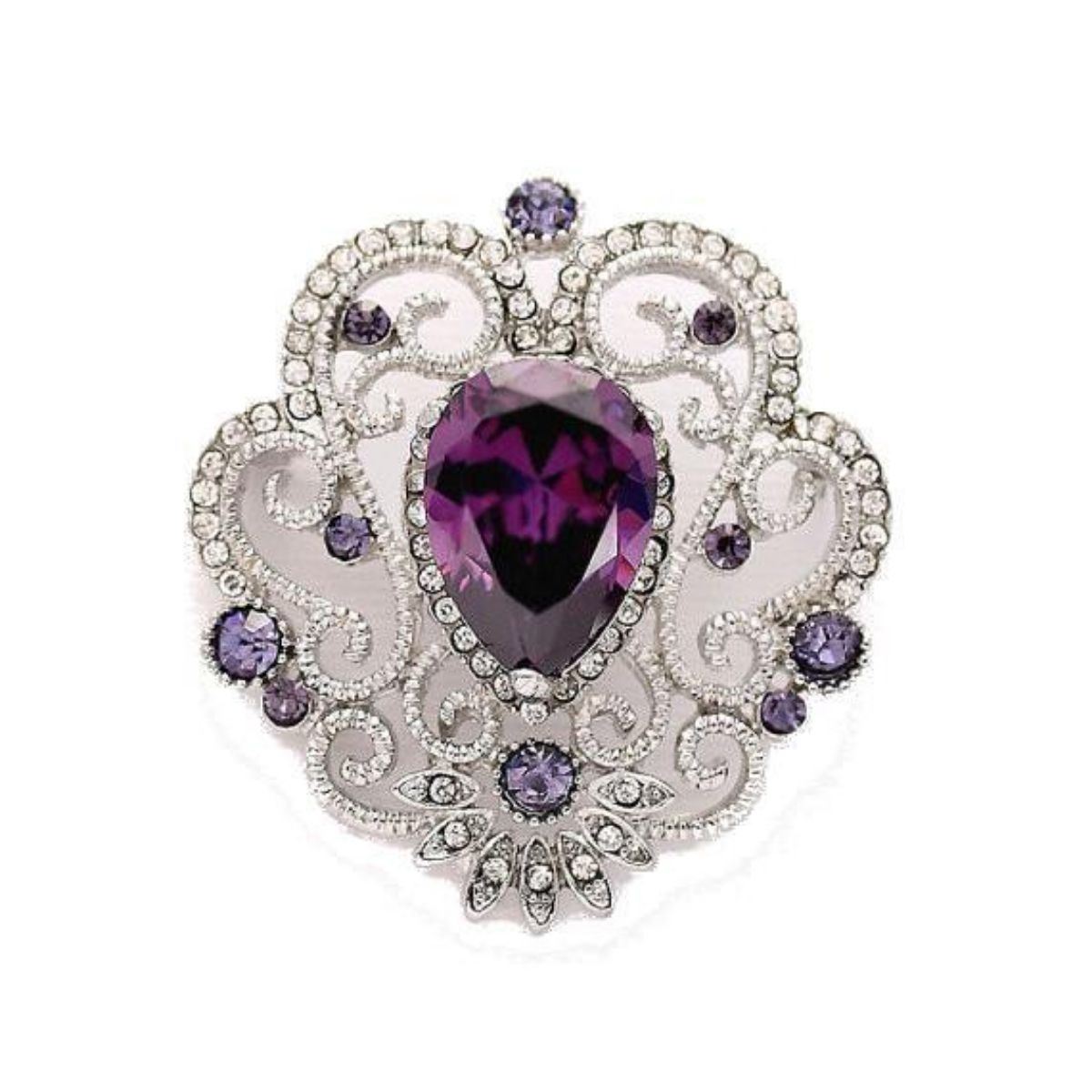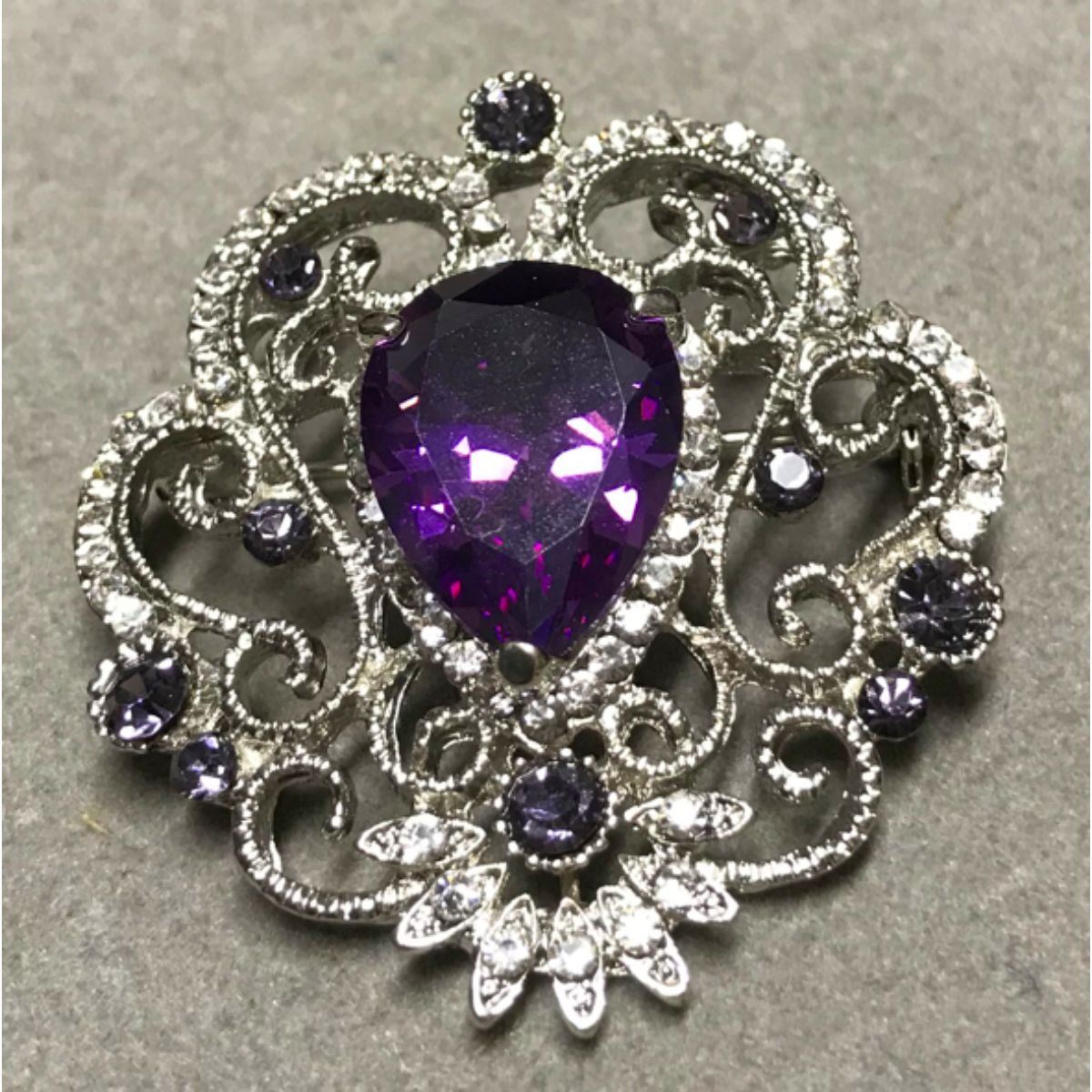 Purple amethyst crystal costume brooch, consisting of a 12x18mm pear-shaped amethyst centerpiece, surrounded by smaller round faceted purple & clear Swaroviski crystals, set into a lattice design brooch pin. 1 5/8"H X 1 1/2" W. Â