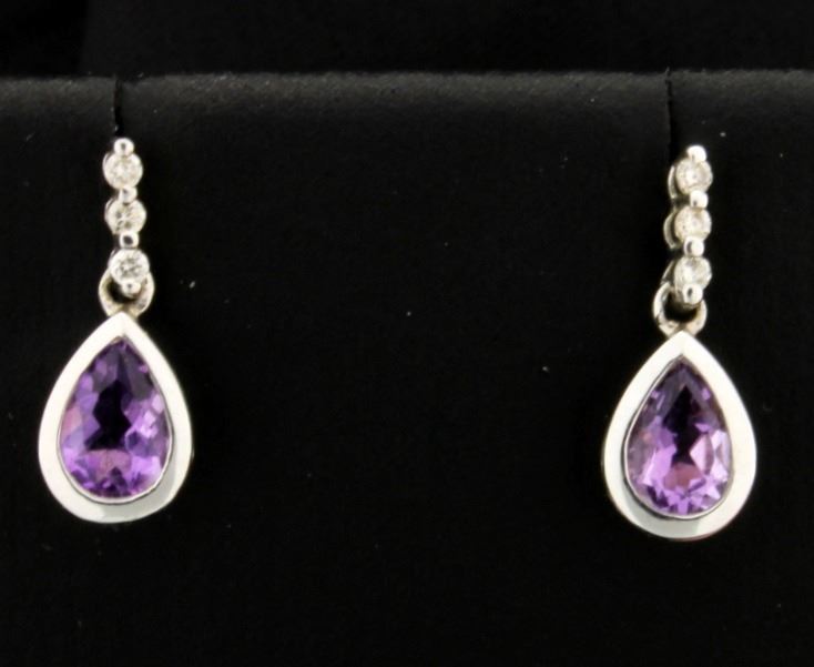 In 9K white gold they are 1/2 inch long and each earring contains one 6x4mm pear shaped amethyst gemstone that has excellent color and clarity, as well as three .01ct round diamonds. They have friction backs. 1.4g