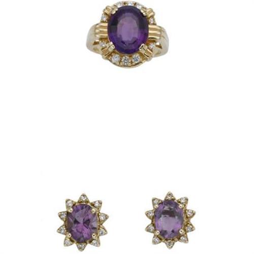 <B>Amethyst, Diamond, Gold Jewelry Lot</B></I> The lot includes: one ring featuring a fancy-cut amethyst measuring 11.75 x 9.90 x 7.60 mm and weighing approximately 4.75 carats, enhanced by full-cut diamonds weighing a total of approximately 0.30 carat, set in 14k yellow gold; together with a pair of earrings, each featuring an oval-shaped amethyst weighing approximately 2.00 carats, enhanced by full-cut diamonds weighing a total of approximately 0.30 carat, set in 14k yellow gold, completed by a post on the reverse. Gross weight for the lot is 14.30 grams.<BR><I>*Note: Ring Size 6 (sizeable)<BR>Earring Dimensions: 1/2 inch x 7/16 inch</B></I><BR><BR><b>Shipping:</b> Miscellaneous Collectibles, Smal (<a target="_blank" href="http://www.heritageauctions.com/common/shipping.php">view shipping information</a>)