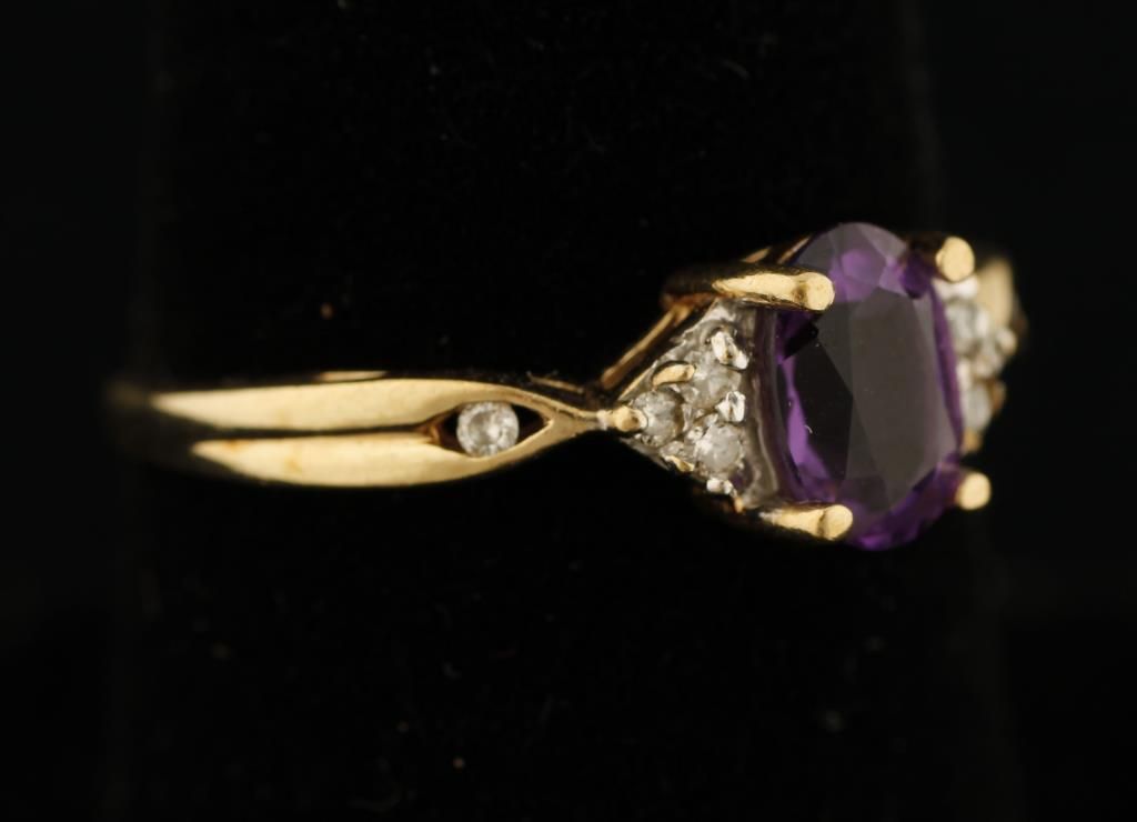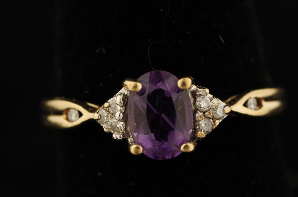 Classy diamond and amethyst in 10K yellow gold. The stones are small but very good quality. The amethyst is a lovely purple and is about 0.85 carats. Accenting the amethyst are 8 lively accent diamonds. The ring is a size 7 1/2. A lovely ring for a young lady.