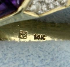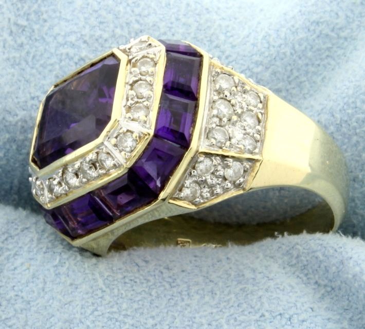 In 14K yellow gold, this ring contains forty-two .02ct high quality round diamonds. The center stone is a 3ct emerald cut amethyst with excellent color and clarity surrounded by 3cts total weight of emerald cut amethyst gemstones also with excellent color and clarity. Size 7 1/4 8.3g