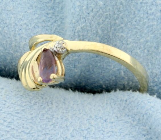 In 10K yellow gold, this ring contains one 5x3mm pear shaped amethyst gemstone that has a small chip on it -hardly noticeable. Also is contains one 1/2pt diamond. Size 6 1/2 1.5g