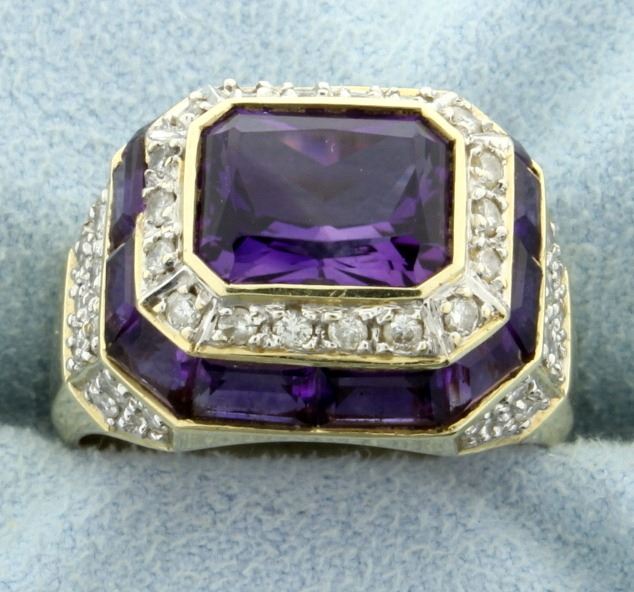 In 14K yellow gold, this ring contains forty-two .02ct high quality round diamonds. The center stone is a 3ct emerald cut amethyst with excellent color and clarity surrounded by 3cts total weight of emerald cut amethyst gemstones also with excellent color and clarity. Size 7 1/4 8.3g