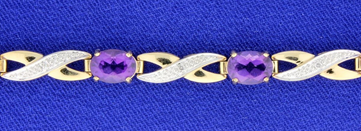 Gorgeous Amethyst and diamond bracelet set in 14k yellow gold. There are 8 oval Amethyst gemstones for a total weight of 10 carats. To make this lovely bracelet sparkle even more, there are 8 diamonds set for a total 0.10 carats. Bracelet measures 7 1/2" long and weighs 9.8g