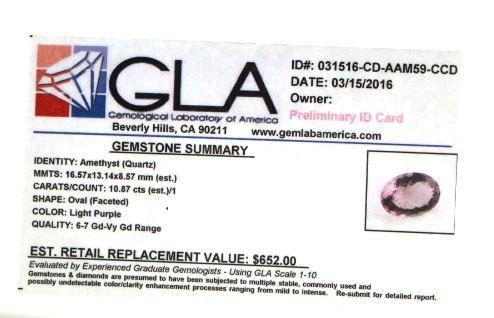 Amethyst (Quartz) GLA Certified 10.87 cts.An additional charge of only $15.00 will apply for a Gemological Service Report issued by GLA which may or may not be shown here on the lot (retails for $45.00- $95.00). Payment of $15.00 for this report must be paid separately on our corporate website at www.cc-digital.com. Please notify us if you would like your name to be listed on the report at the time of payment so that it can be included in the shipment.