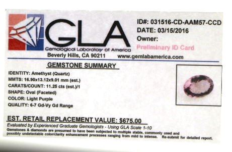 Amethyst (Quartz) GLA Certified 11.25 cts. An additional charge of only $15.00 will apply for a Gemological Service Report issued by GLA which may or may not be shown here on the lot (retails for $45.00- $95.00). Payment of $15.00 for this report must be paid separately on our corporate website at www.cc-digital.com. Please notify us if you would like your name to be listed on the report at the time of payment so that it can be included in the shipment.