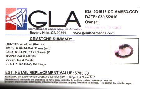 Amethyst (Quartz) GLA Certified 11.76 cts.An additional charge of only $15.00 will apply for a Gemological Service Report issued by GLA which may or may not be shown here on the lot (retails for $45.00- $95.00). Payment of $15.00 for this report must be paid separately on our corporate website at www.cc-digital.com. Please notify us if you would like your name to be listed on the report at the time of payment so that it can be included in the shipment.