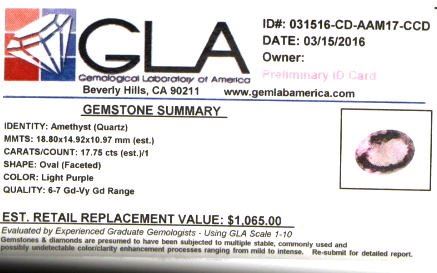 Amethyst (Quartz) GLA Certified 17.76 cts.An additional charge of only $15.00 will apply for a Gemological Service Report issued by GLA which may or may not be shown here on the lot (retails for $45.00- $95.00). Payment of $15.00 for this report must be paid separately on our corporate website at www.cc-digital.com. Please notify us if you would like your name to be listed on the report at the time of payment so that it can be included in the shipment.