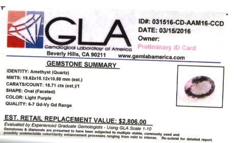 Amethyst (Quartz) GLA Certified 18.71 cts. An additional charge of only $15.00 will apply for a Gemological Service Report issued by GLA which may or may not be shown here on the lot (retails for $45.00- $95.00). Payment of $15.00 for this report must be paid separately on our corporate website at www.cc-digital.com. Please notify us if you would like your name to be listed on the report at the time of payment so that it can be included in the shipment.