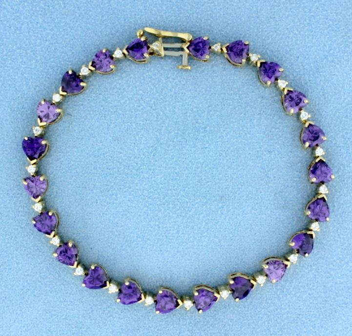 Heart shaped Amethyst gemstones around 1/2 ct each, approx 5mm. Around 11 cts total weight. Diamonds are G color, SI clarity, approximately 1/2 ct TW. 7.25 inches. 14k yellow gold. 13.1g.