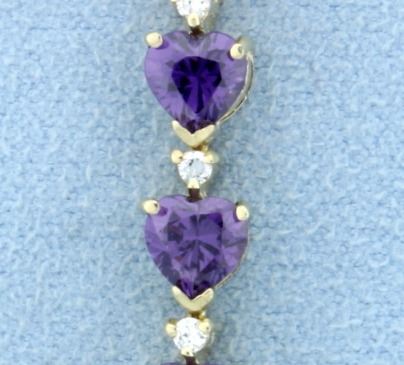 Heart shaped Amethyst gemstones around 1/2 ct each, approx 5mm. Around 11 cts total weight. Diamonds are G color, SI clarity, approximately 1/2 ct TW. 7.25 inches. 14k yellow gold. 13.1g.