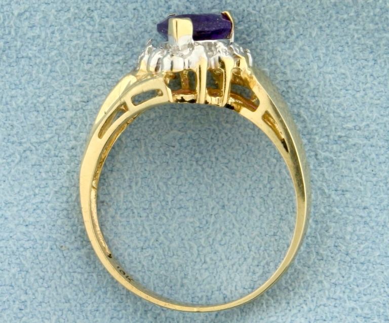In 10k yellow and white gold. Contains a 6x6mm heart shaped natural amethyst gemstone with desirable deep purple color and excellent clarity. Also contains three high quality .005ct diamonds. Size 6. 2.2g.
