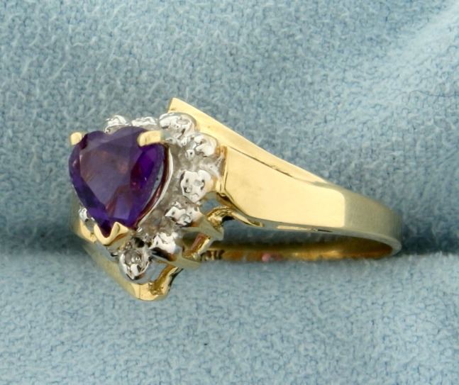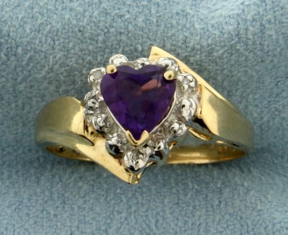 In 10k yellow and white gold. Contains a 6x6mm heart shaped natural amethyst gemstone with desirable deep purple color and excellent clarity. Also contains three high quality .005ct diamonds. Size 6. 2.2g.