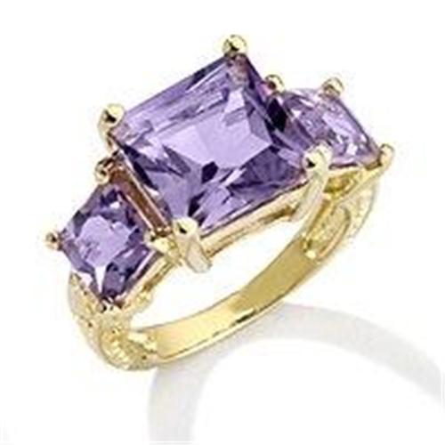 Size 9---Three princess cut, violet/purple amethysts are prong set in this 14kt. yellow gold ring. The setting exhibits approx. 5.6ctw. of natural amethysts. The center stone is 10mm sided by two 6mm stones.